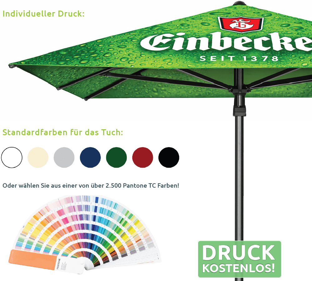 • flexibel einsetzbarDer Logodruck ist kostenlos – aber nicht verpflichtend. Auf Wunsch liefern wir Ihre Schirme auch komplett in Ihrer Wunschfarbe – ebenfalls kostenlos.