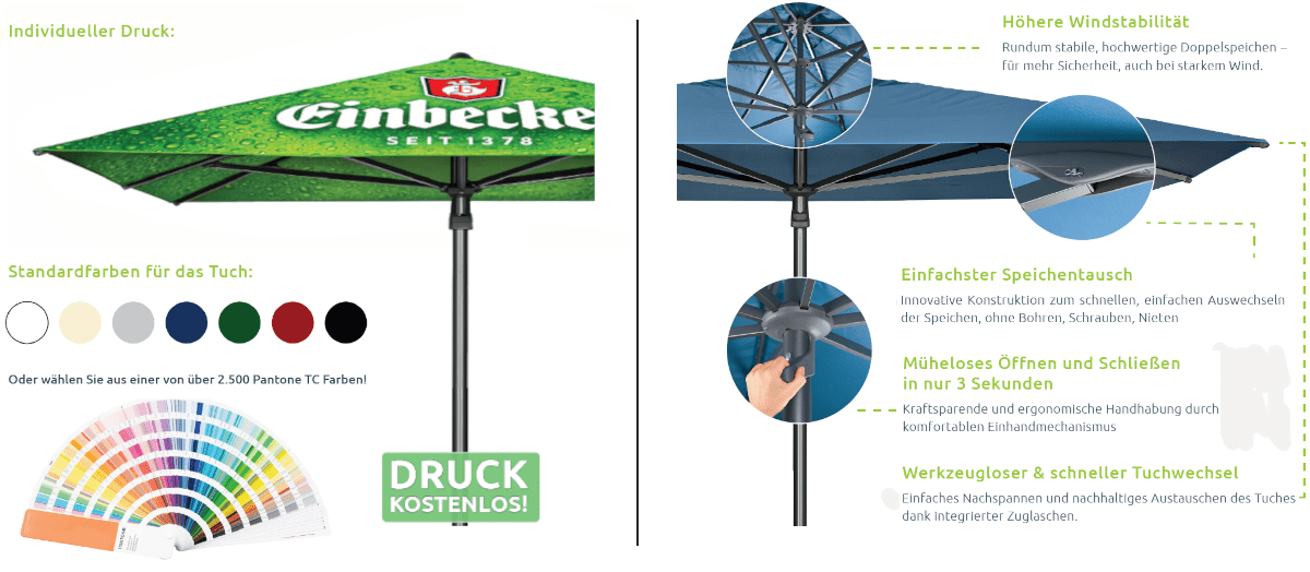Hochwertige Gastro-Schirme in zwei Preis- und Qualitätsstufen - mit kostenlosem Logodruck und bis zu 5 Jahren Garantie