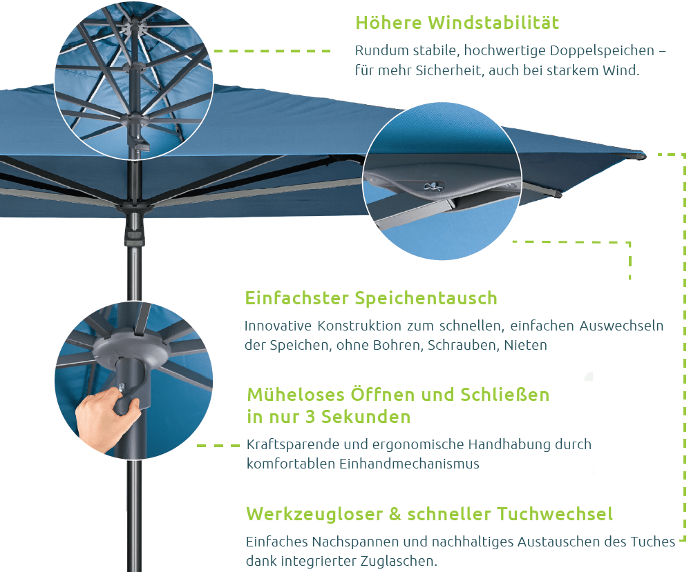 – sämtliche Teile austauschbar inkl. 5 Jahren GarantieJetzt ganz neu: Werkzeugloser Tuchwechsel & Speichen-Schnellwechselsystem. Dadurch nachhaltiger als andere Schirme. Das Gestell muss theoretisch nie entsorgt werden. Einfach Tuch austauschen und Schirm weiter verwenden.