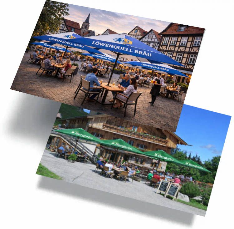 Unsere Schirme wurden speziell für den harten Ausschank-Alltag entwickelt und lassen sich wirtschaftlich an Partnerbetriebe weitergeben – kostenlos, bezuschusst oder als Leihmodell.